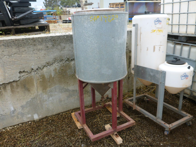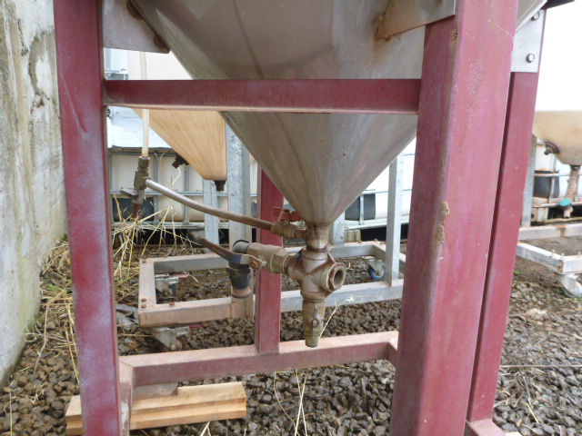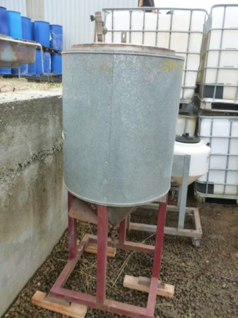 250LITRE STAINLESS STEEL INSULATED VESSEL WTH CONICAL BOTTOM ON STEEL FRAME.
