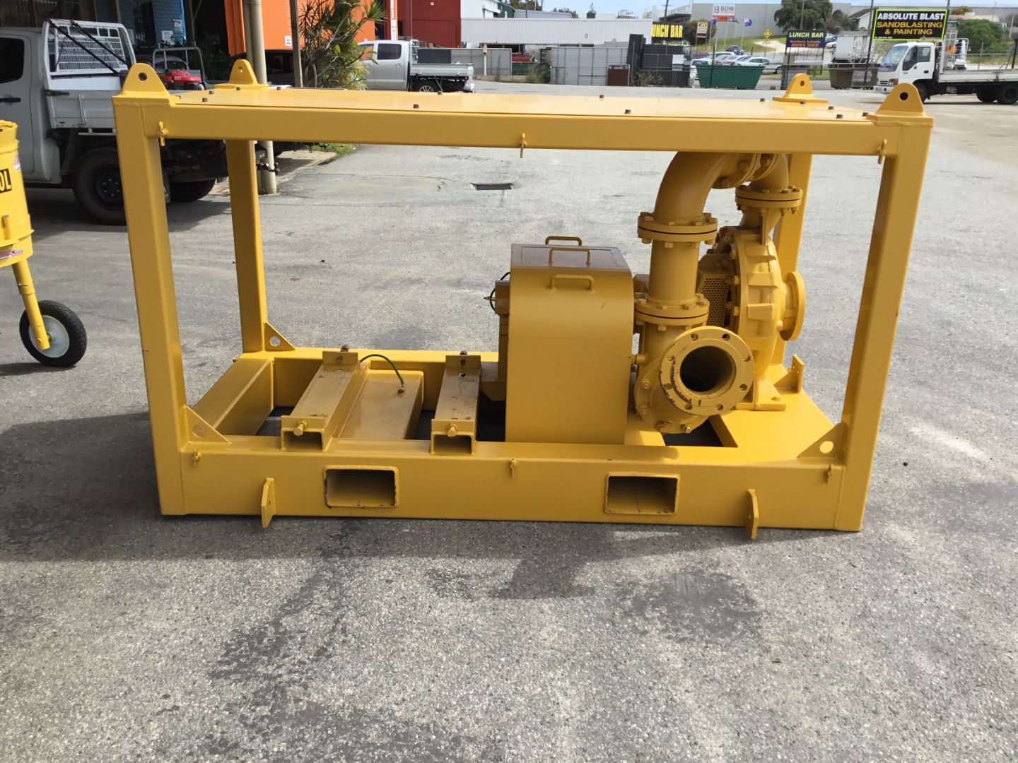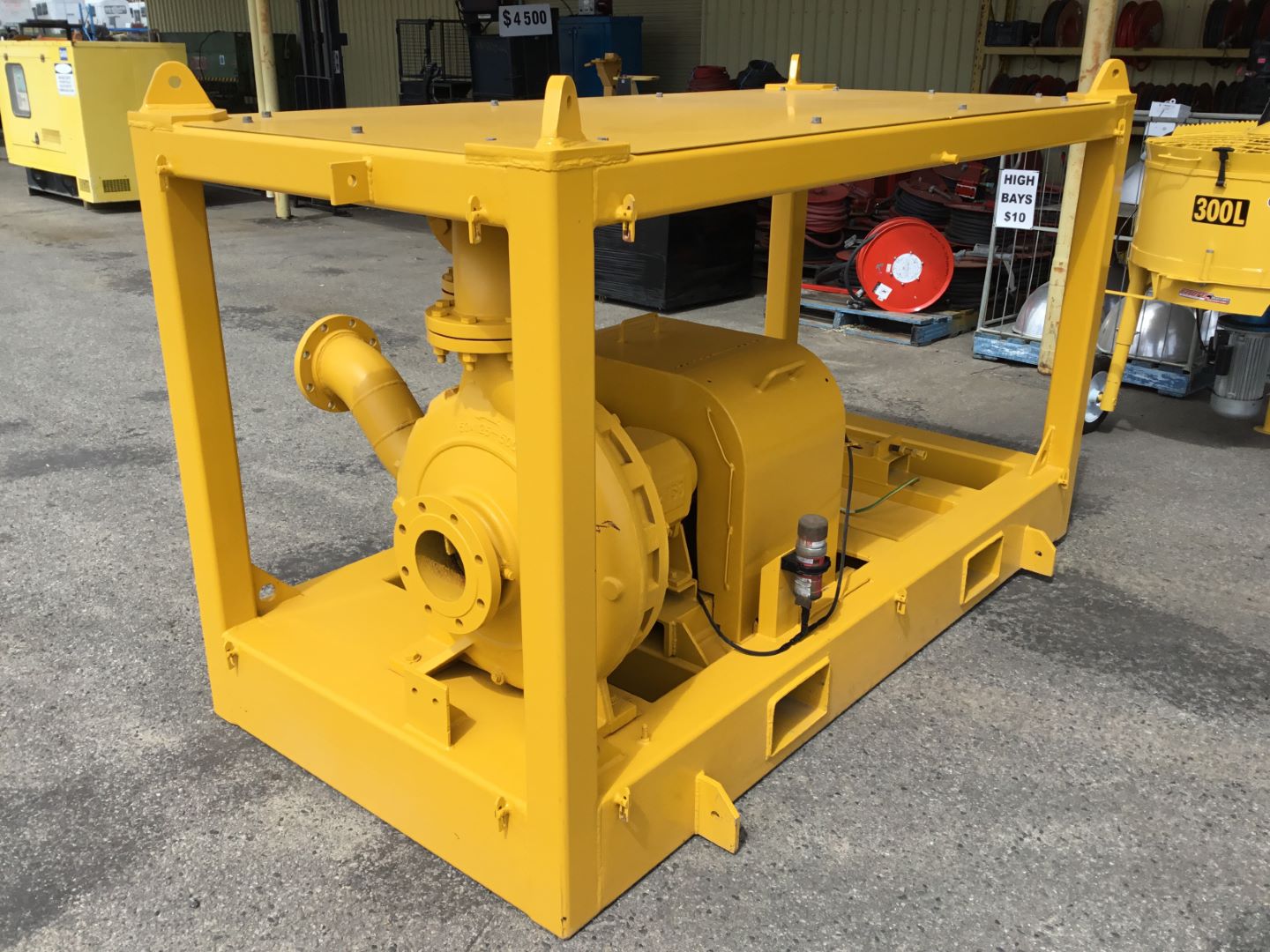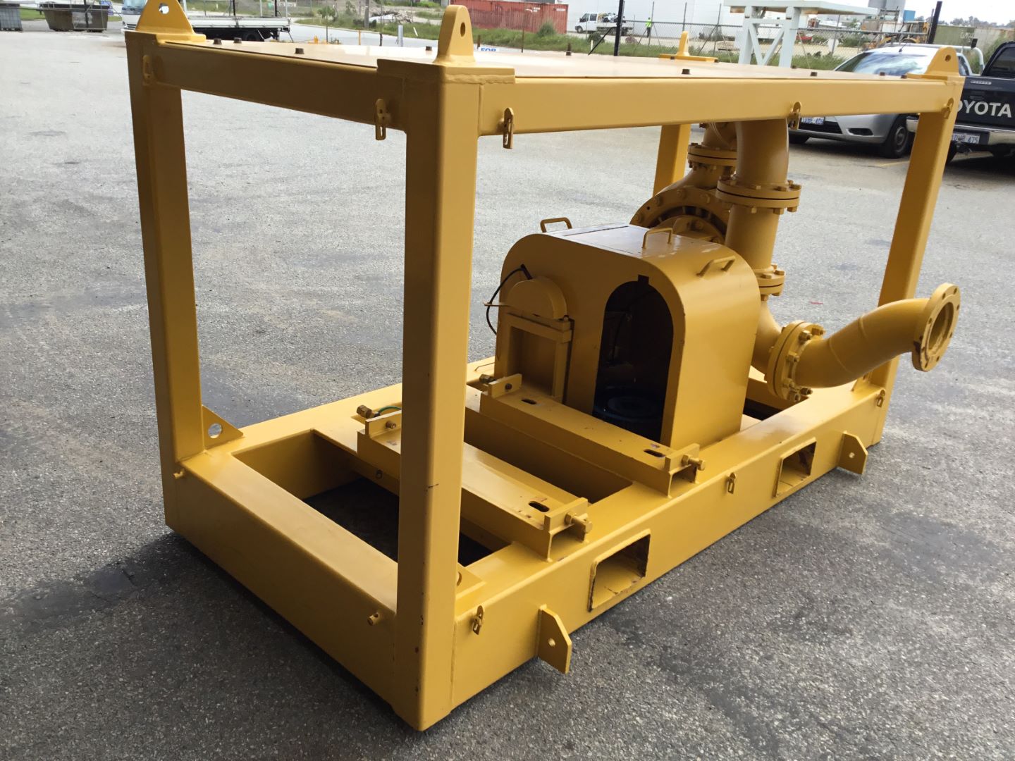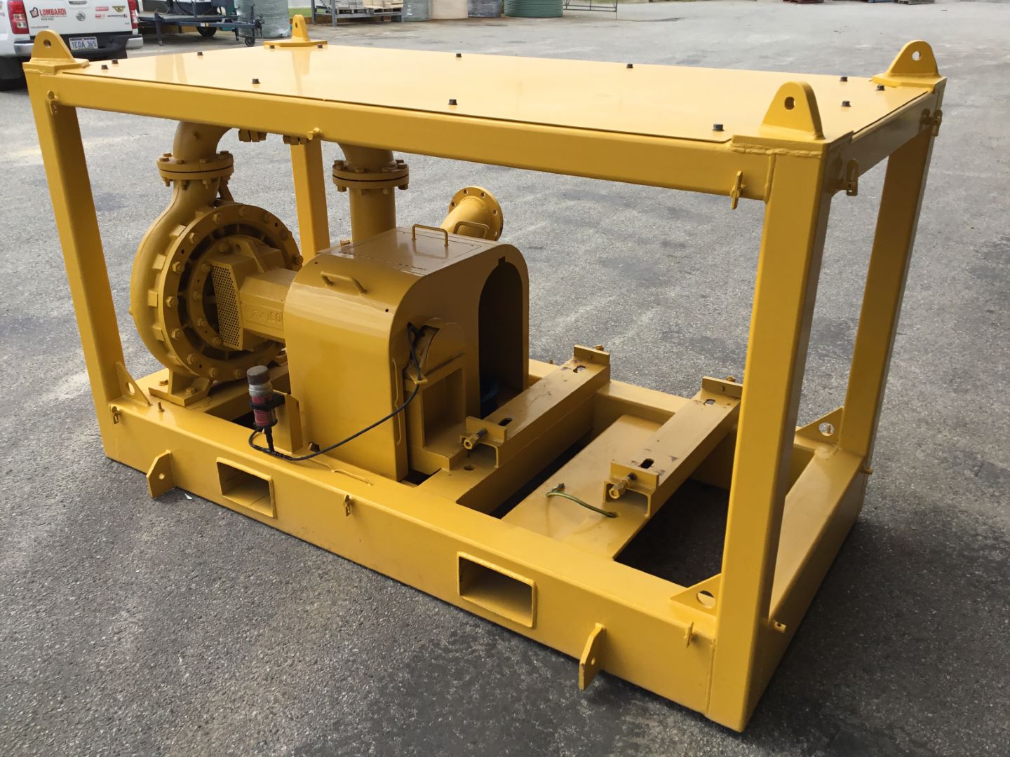 Unit is fitted to heavy duty lifting frame with fork pockets , lift eyes , tie down lugs & removable mesh guards.. Auto lube to support bearings.