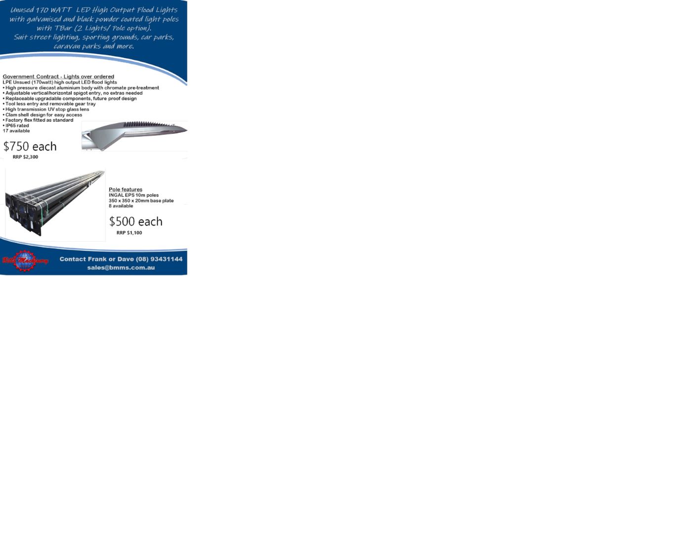 UNUSED (Over order on Government job) 170WATT HIGH POWER LED FLOOD LIGHTS WITH 10M GALVANISED & BLACK POWDER COATED LIGHT POLES WITH TBAR.(2 LIGHTS/POLE OPTION) SUIT STREET LIGHTING , SPORTING GROUNDS , CARPARKS CARAVAN PARKS ETC.(8 poles & 17 lights available) ($500/LIGHT , $500/POLE)