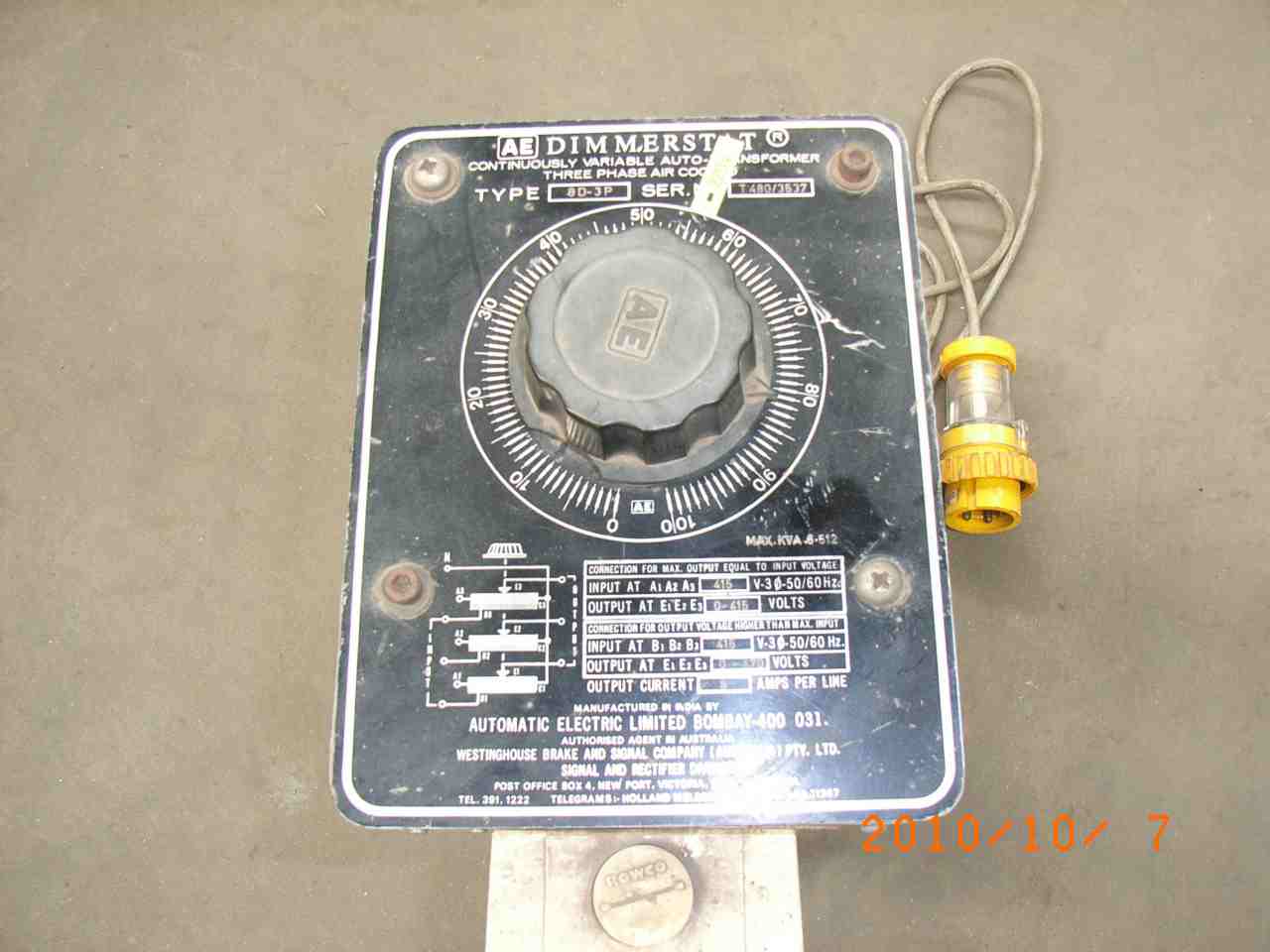 WESTINGHOUSE VARIAC / 3 PHASE 0 – 470 VOLT, Model Type 8D-3P, 8 Amps per phase, with lead, 3 phase plug and socket.